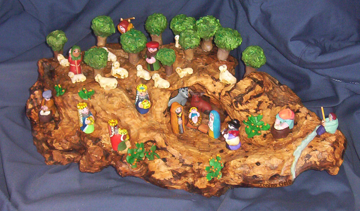 "Nei presepi di Tonino Gelo i personaggi sono realizzati nella prospettiva anatomica resa nella astrazione, nella conformità della struttura che regge una realtà simbolica che esprime la fisionomia emotiva del personaggio che lo scultore ha impresso. Nel legno ha ritrovato l'essenza della configurazione delle case, dei sentieri, del torrente nella prospettiva della miniatura e nella essenzialità del simbolo che il legno scolpito rappresenta"